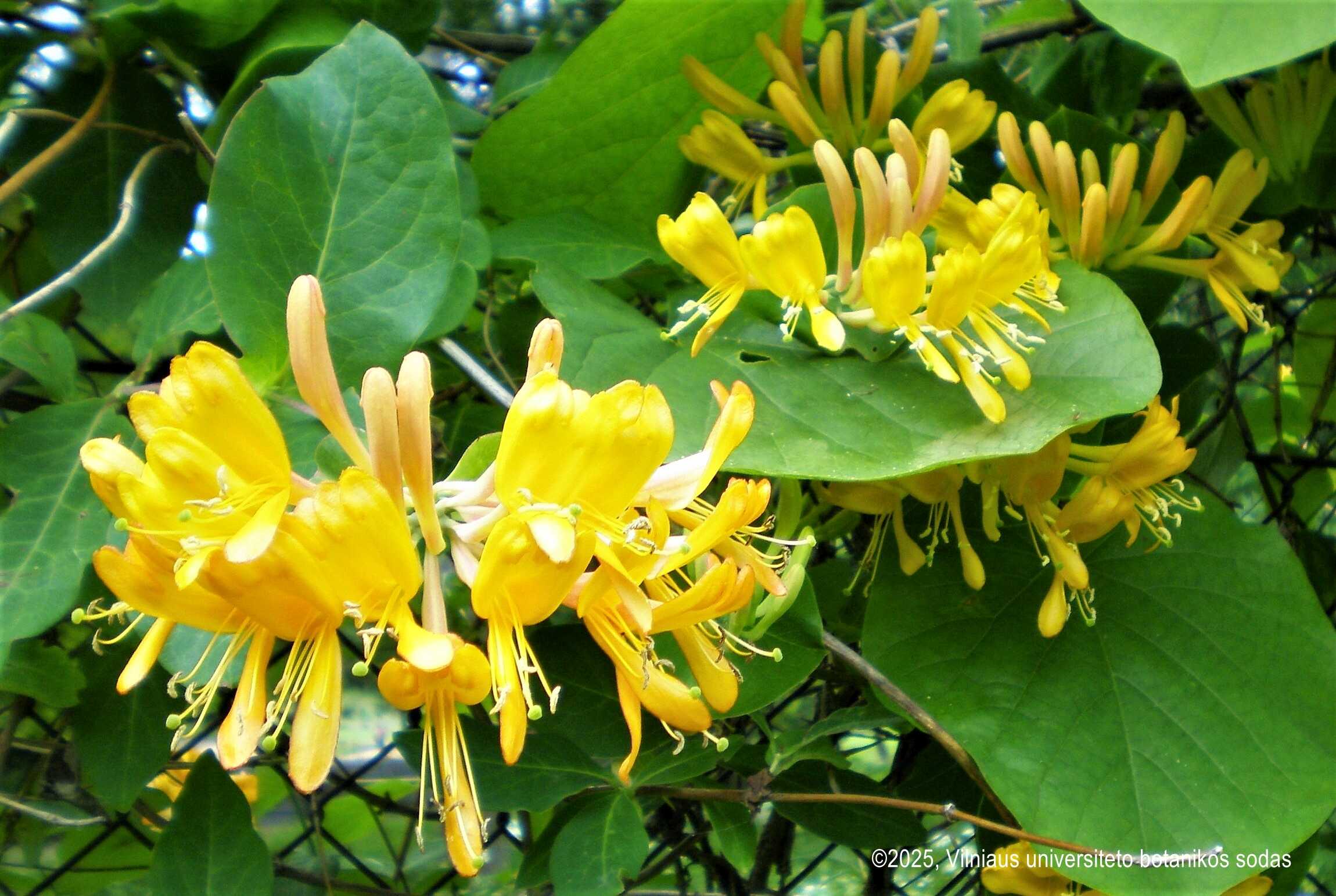 Stambiažiedis (Telmano) sausmedis (Lonicera x tellmanniana) Aukšta, iki 5 m aukščio pakylanti liana. Lapai pailgi, smailiom viršūnėm arba buki, pleištišku pamatu, 6 – 10 cm ilgio ir 2,5 – 5 cm pločio. Viršutinė lapo pusė ryškiai žalia, apatinė melsva, plaukuota. Jauni lapai purpuriniai. Vaisinių šakelių paskutinės dvi lapų poros suaugę ir sudaro eliptišką diską virš kurio sukrauna žiedus. Žiedai iki 5 – 6 cm ilgio, aukso geltonumo vamzdeliai, sutelkti į varpos pavidalo žiedynus trumpųjų šakelių galuose. Gausiai žydi birželio mėn., dvi savaites. Vaisiai - oranžinės 0,6 – 10 mm skersmens uogos, kurios gražiai atrodo lapų lėkštelėse. Jautrus šalčiams, nemėgsta užmirkusios dirvos. Geriausia sodinti šiltoje saulėtoje vietoje, pavyzdžiui prie pietinės namo sienos. Tai hibridinė sausmedžio veislė išvesta sukryžminus L. sempervirens ir L. tragophylla.