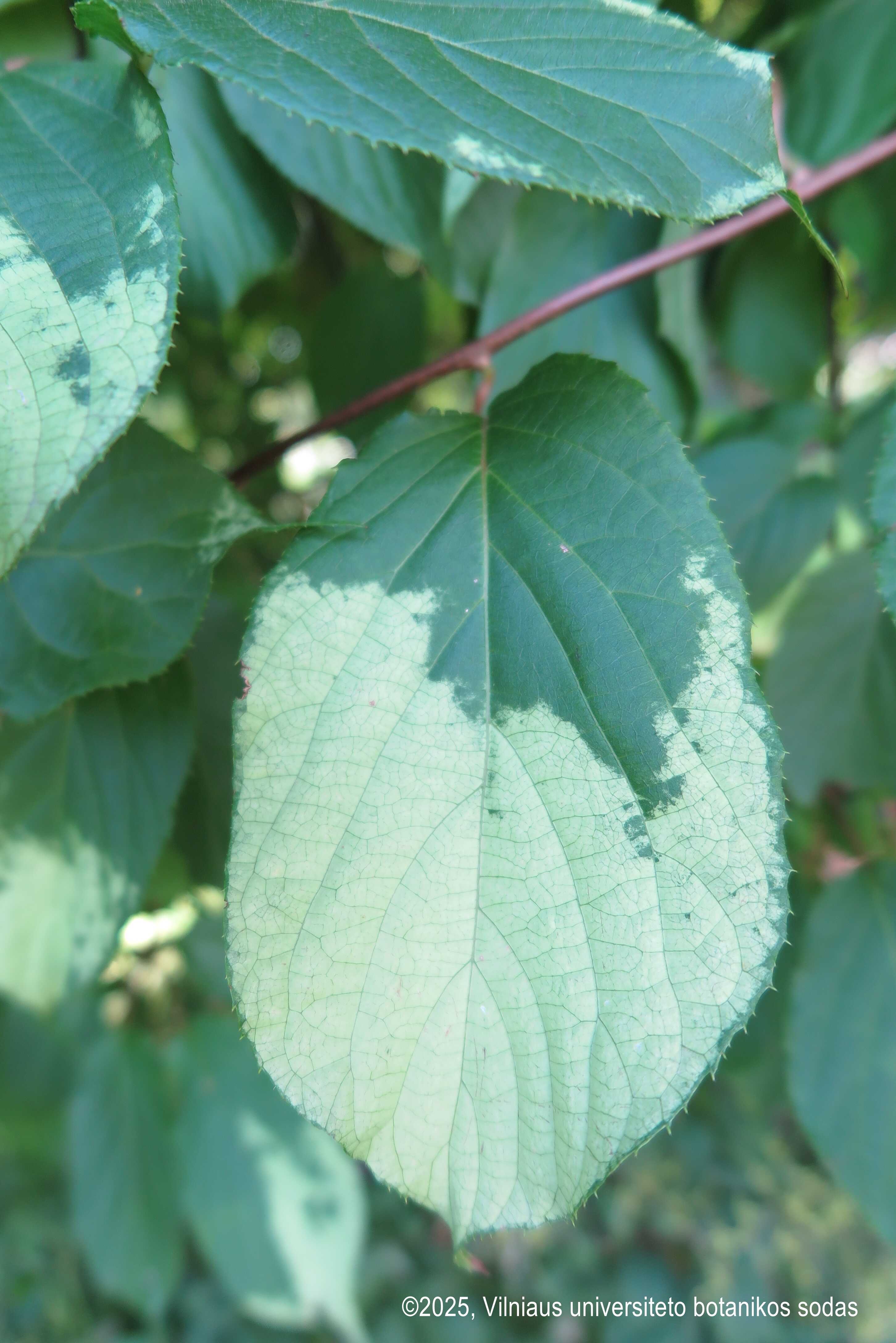 Margalapė aktinidija (Actinidia kolomikta) Liana, užauganti iki 3–5 m aukščio. Be atramos gali augti kaip 1,5–2 m. aukščio krūmas su nulinkusiais ūgliais. Metinis prieaugis 1–2 m. Stiebai sumedėję, lygūs, rudi ar rausvai rudi, vijasi apie atramą, jauni ūgliai žali. Lapai pražanginiai, ovalūs arba kiaušiniški, trumpai nusmailėjusia viršūne, dvigubai dantytu pakraščiu, apvaliu ar širdišku pamatu, 8–16 cm ilgio. Viršutinė pusė žalia; vyriškų augalų lapai žydėjimo metu tampa margi (žali, balti, rausvai rožiniai). Rudenį pagelsta. Lapkočiai rausvi. Žiedai balti, kvapūs, nusvirę, pavieniai arba po 2–3 lapų pažastyse; žydi gegužės–birželio mėn., ant antramečių ir vyresnių ūglių. Vaisiai pailgai eliptiški, žali, daugiasėkliai, saldūs ir kvapnūs, 3–3,5 cm ilgio; sunoksta spalio–lapkričio mėn., dera nuo 2–3 metų. Auginama saulėtoje ar pusiau pavėsingoje vietoje, mėgsta vidutinio drėgnumo dirvą; dirvožemiui nereikli. Atspari šalčiui (USDA 4–8). |