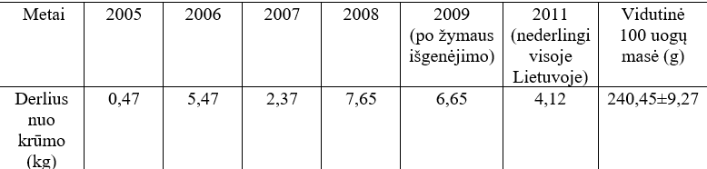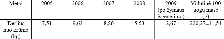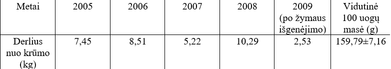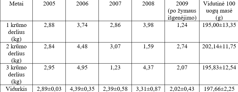 Vidutinis derlius sudaro 3,25 ± 0,32 kg nuo krūmo.